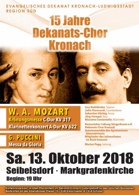 Der Dekanats - Chor Kronach wurde 2003 durch seinen Leiter, Dekanatskantor Marius Popp, gegründet. Auf seinem Programm stehen sowohl a-cappella- als auch große oratorische Werke mit Orchester wie Weihnachtsoratorium 1-6, Johannes- und Matthäus- Passion von Bach, Beethovens 9. Symphonie, Bruckners Messe Nr. 3 f-Moll und Te Deum, Schöpfung von Haydn, Messias von Händel, Dvořáks Te Deumund Messe D-Dur, Paulus von Mendelssohn, Krönungsmesse und Requiem von Mozart, Duruflés und Faurés Requiem und SchumannsMesse D-Dur.